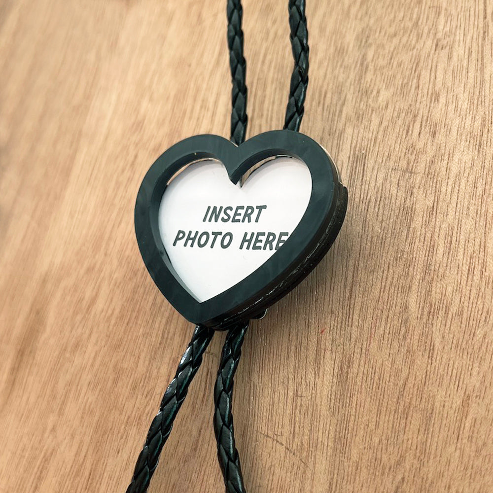 This cute heart-shaped bolo tie works as a mini picture frame, complete with clear acrylic glass, and just enough room to add any image you'd like!