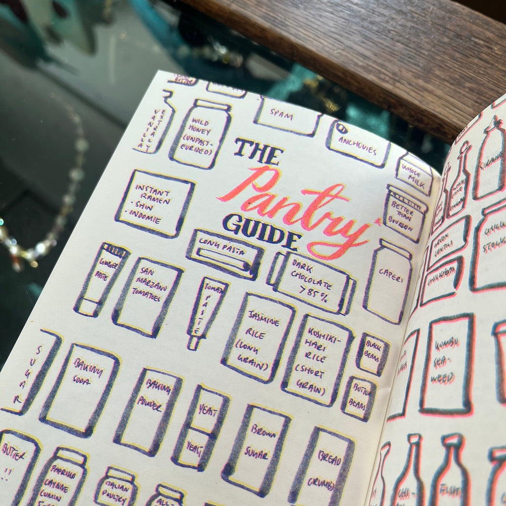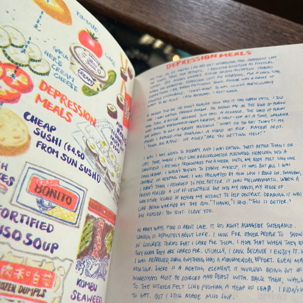 A 3-color risograph zine featuring a series of short essays from Christina Hu about the important people in her life, and illustrations of the food she's cooked for them; Some are happy stories, some are sad, and it includes a way to get recipes for all of her illustrations.
